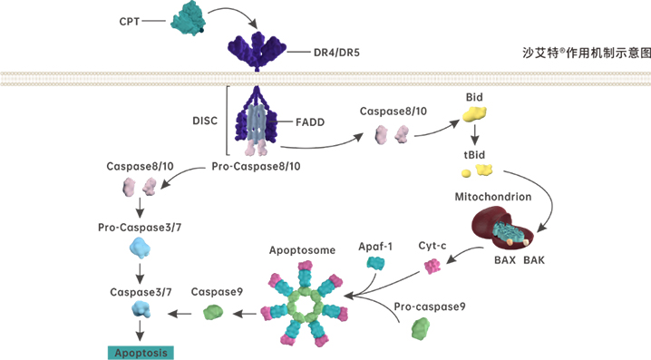 注射用埃普奈明為重組變構人腫瘤壞死因子相關(guān)凋亡誘導配體(Circularly Permuted TRAIL,CPT),可結合并激活腫瘤細胞表面的死亡受體4(DR4)/死亡受體5(DR5),誘導不依賴(lài)p53的腫瘤細胞凋亡。